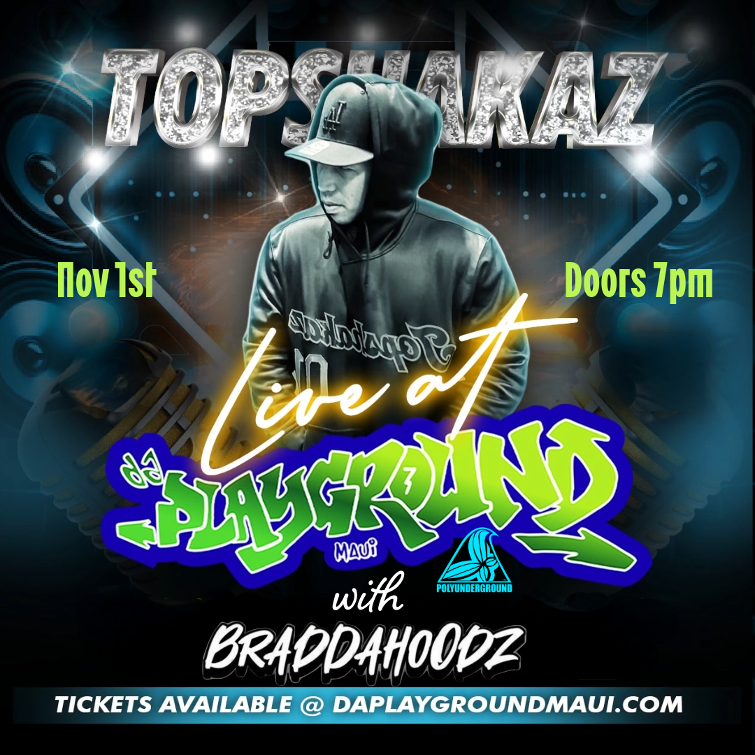 🔥TOPSHAKAZ are back! Rooted in Hawaiian/reggae/rap influences, hailing from Waialua, O'ahu - they're returning for one night only to da Playground Maui. Get ready for a night of big sound, heavy vibes, island roots and global energy.