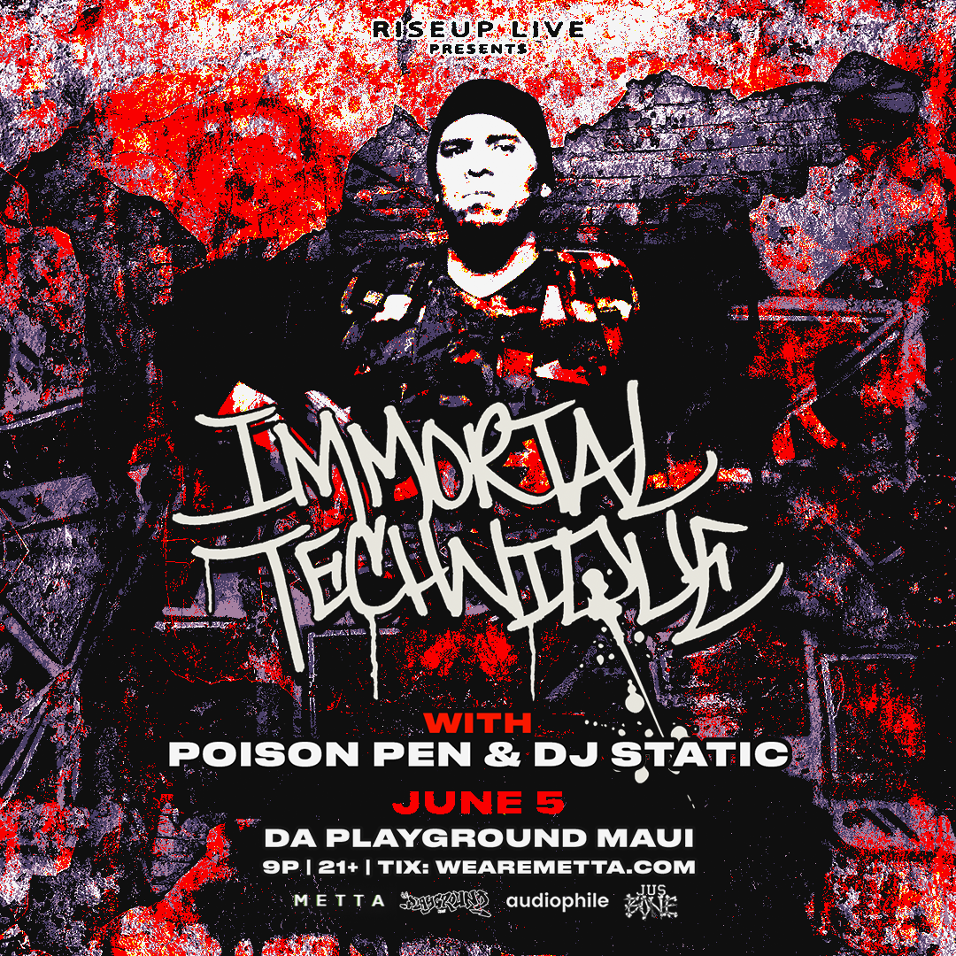 Get ready for an unforgettable night as the legendary hip-hop artist and activist Immortal Technique takes the stage live! Experience raw energy, powerful lyrics, and unstoppable passion as he delivers his iconic revolutionary anthems right in the heart of Maui.